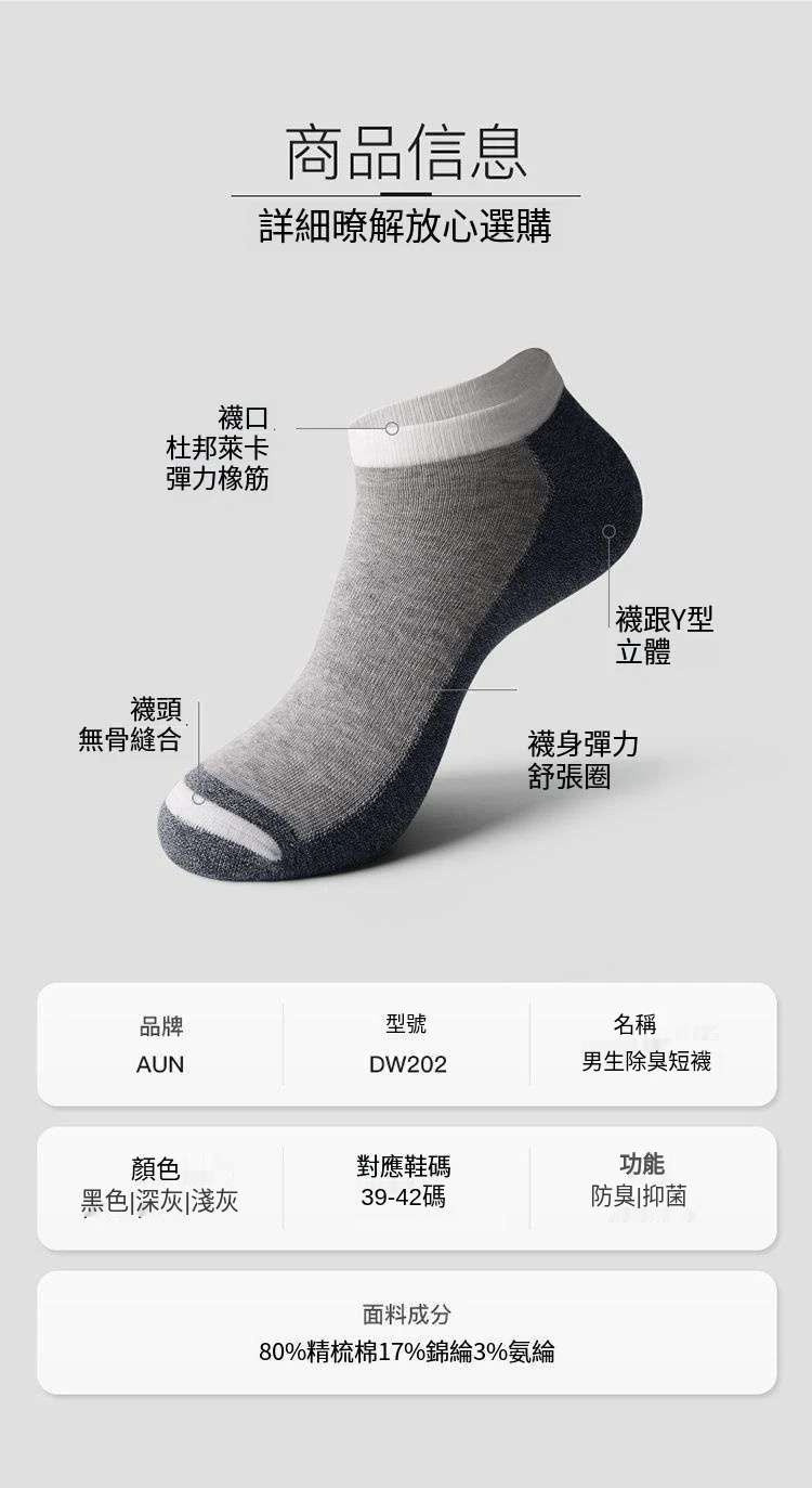商品詳情 ▪品牌:AUN▪顏色:2黑色2深灰2淺灰▪尺寸:均碼(適合腳長 24∼26 CM)▪材質:80%精梳棉、17%聚酯纖維、3%萊卡 【AUN】6雙男士簡約薄款短襪 DW202 TWD $940 TWD $698